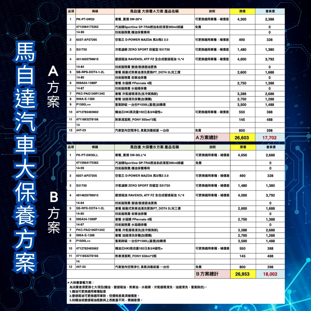 【VIP方案】國產車系-大保養-馬自達汽車B方案。(消費積點:40)